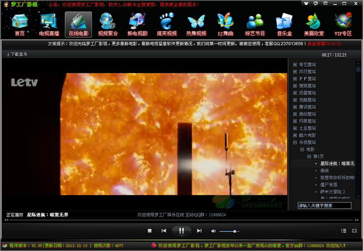 梦工厂影视是一款免费的收集网络上几百上千个电视直播频道的网络视频播放器,它囊括主流网络音乐站点、影视、随心听、随心看!集电视直播,在线电影,在线音乐等功能,绿色版,不需要安装,少部分杀毒软件可能误报,请添加信任。