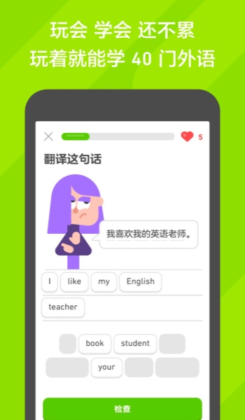 4、学习辅助功能实用:每课都包含听力、发音、翻译及多项选择等多重挑战,并能即时查看答案正确情况,当用户回答错误时会提供提升建议。此外,还有连胜统计等功能,激励用户完成学习目标。名,获得虚拟奖励,增加学习的乐趣和动力。