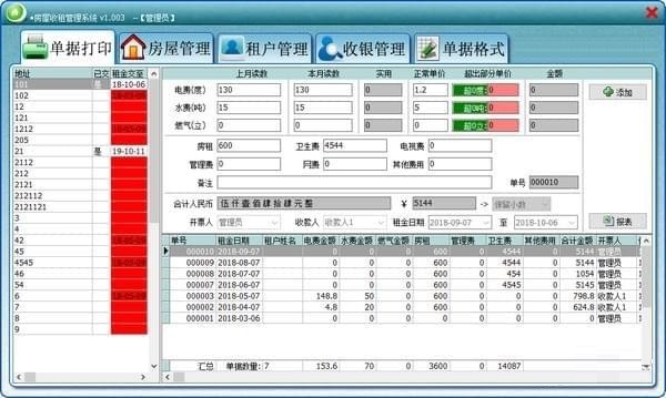 添加完房屋资料及其他资料后,就可以开始日常打单使用了,在单据打印界面点击添加一张新单据,填写水电燃气读数,水电燃气单价,租金费用等,备注处可填写当月额外费用内容(如维修费等…),选择开票人及收款人姓名,选择租金日期,(如下图)