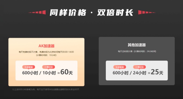 4、超长免费加速:AK加速器拥有每天固定时段的全员免费加速,以上按600小时套餐为例,每天全天使用AK加速器加速畅玩时长多达60天。