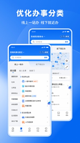 个人或企业用户都能在此找到已实现在线办理的所有审批服务、政务服务,APP根据精准定 位,为您提供当地个性化掌上办事服务。