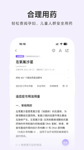 ·药品信息:超 50000 份国内外上市药品说明书免费查阅,以及 1500+ 药物成分(ATC 分类)的合理用药指导,包括用法用量(含国内外用法用量对比)、安全用药(含特殊人群用药调整、妊娠哺乳用药安全、药物警戒等)、药理毒理、患者教育等受医生关注的用药疑问