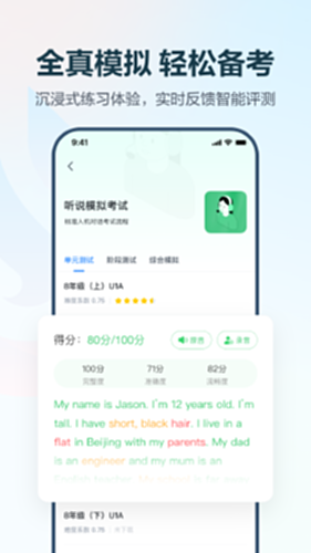 3. 课文跟读:同步教材课文,支持逐句模仿跟读和实时评测,提高口语能力