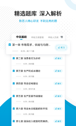 经济师APP根据考生学习的使用习惯,提供多种的练习模式,包括:模拟试题、每日一练、考点章节练习、高频考点的功能。