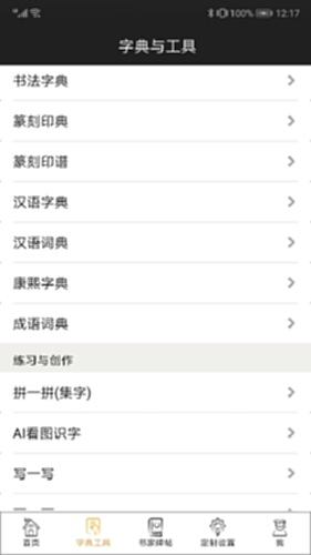 5,工具提供书法字典、篆刻印典、印谱、汉语字典、书论日历等等;
