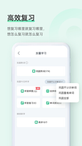 采用学习、复习两套科学的智能算法,自动根据你的记忆效果智能调整你的单词学习安排,固强补弱,重点突出,让你用最少的时间掌握最多的词汇。
