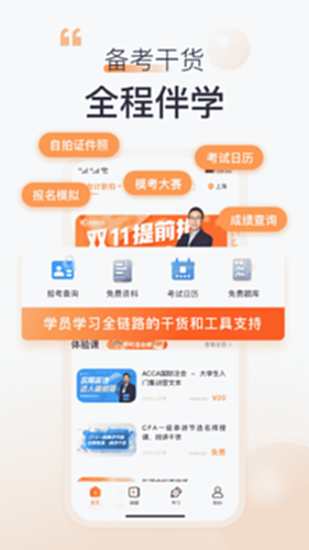 4.学习工具:学员学习全链路的干活和功能支持,如报考查询、领取资料、考试日历、报考指南、自拍证件照、报名模拟、模考大赛、考试日历、成绩查询等