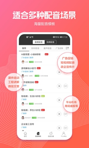 3、多场景配音模板:提供政企宣传片配音、商业广告配音、彩铃配音等多种tts配音场景模板
