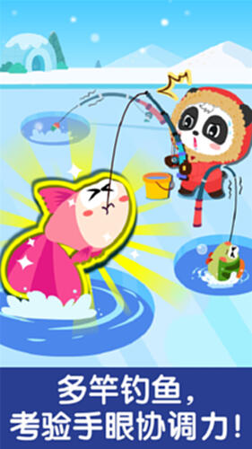 同时使用四根鱼竿钓鱼,你敢挑战吗?凿开冰洞,放下鱼竿等待。哇!鱼儿上钩了,三根鱼竿同时钓到小鱼!快收起鱼竿,不要让小鱼跑掉。