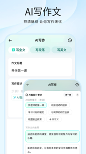 别再为“不知道从哪写起”、“不知道如何下笔”而苦恼了。现在有了我们的「AI写作」功能,不仅能帮你分析题目、整理写作思路,还能帮助你合成作文写出好文章。