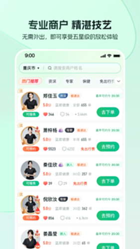 您可自选技师并查看技师的详细介绍(距离、头像、从业经验、状态、评论),项目、下单、支付的。