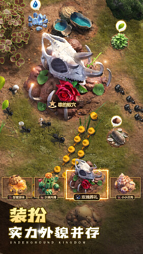 蚁巢布局自由选择,创造属于自己的美丽国度。可以通过挖掘、开拓打造精美外观,蚁巢内的建筑布置,皆由你一手掌控。从小小蚁巢,到繁荣蚁国。