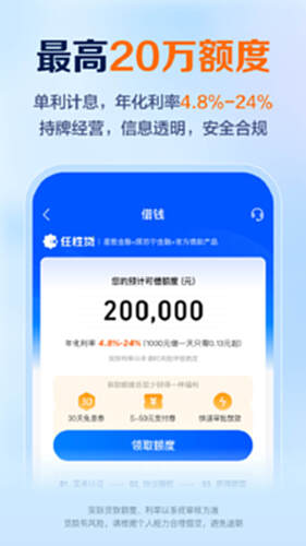 任性贷借款额度至高20万,灵活分期,审核快至1分钟,合规平台,信息安全,息费透明,年化利率7.2%起(单利),实际借款额度、通过率、利率以客户申请时的风险评级而定。请根据个人能力合理贷款,避免逾期。