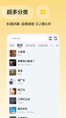 1、海量音频内容:提供抖音热歌、经典老歌、广场舞音乐、华语流行、DJ、轻音乐、儿歌等多种分类。