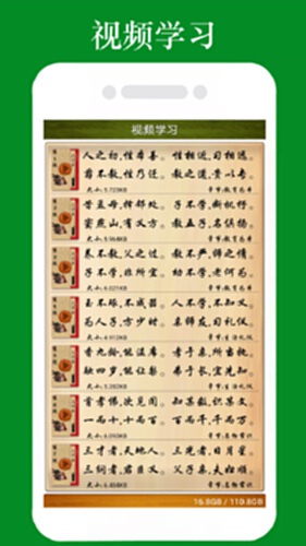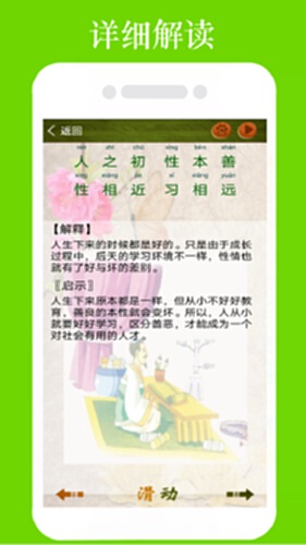 2.两种学习模式:一种分段朗读解释便于孩子家长共同理解学习三字经;一种全文顺序循环朗读,逐行跟踪滚动显示当前朗读内容,便于孩子跟随一起咏读学习。