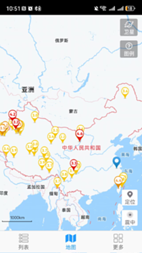 3、地震列表上的所有地震可以定位到地图上,震级大小和发震时刻通过标注符号区分;