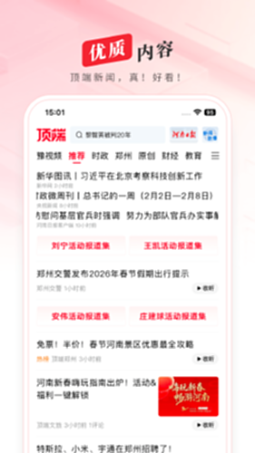 顶端新闻是一款由河南省委直属的权威主流媒体平台推出的新闻 APP。它运用人工智能技术,为新主流群体提供个性化、年轻化和视频化的新闻资讯、政务信息以及本地生活服务。