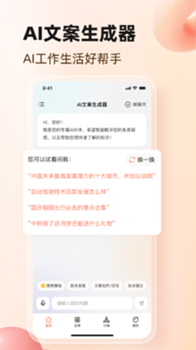 AI文案生成器提供了小红书、微博、朋友圈、公众号和抖音以及各种日常日报、周报等相关文案的生成功能。并且有基于大模型的AI对话全能应用,可以为用户在工作和生活中的各种需求和提供帮助。