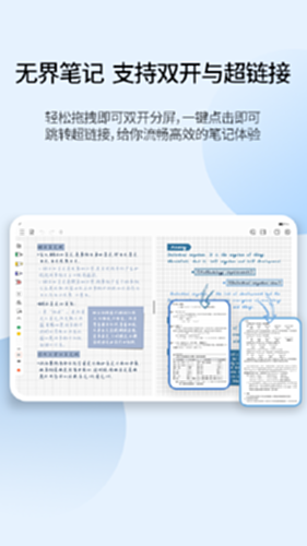 无界笔记、普通笔记、PDF 笔记、手账等笔记形式 导入 PDF、PPT、Doc、JPEG、PNG 等多种文件格式 插入 GIF、图片、音频、超链接等多种常见内容