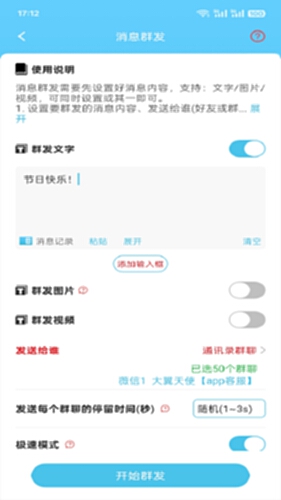 微信群发助手是一款功能强大的APP,将微粉助手和微商营销整合,支持多种格式的内容群发,帮助用户高效推广产品并提升信息传播效率,不断完善其服务以成为出色的群发工具。