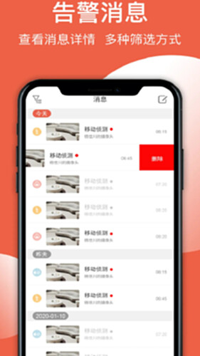 智能消息管理:消息中心的消息会自动根据捕捉产生的日期不同整合分组,不同的消息有不同的图标形状内容,方便用户区分。并且采用扁平化设计,每一条信息的删除功能隐藏,左滑即可展开删除工具,操作便捷。