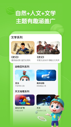 -《哺乳动物》、《生活中的物理》、《人体》、《恐龙》、《海洋动物》、《天文》、《昆虫》、《鸟类》、《植物》等你来学