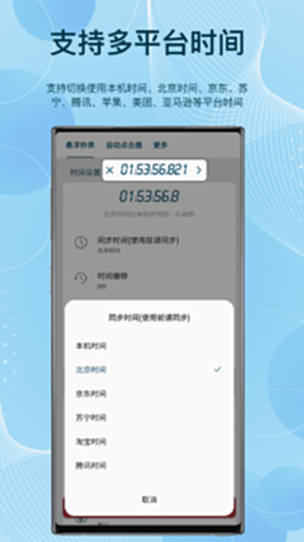 独创性地将悬浮秒表的精准计时和自动点击器的精准定时自动点击结合在一起,实现使用所选的平台时间(如北京时间)进行毫秒级定时自动点击,极大提高抢购成功率。