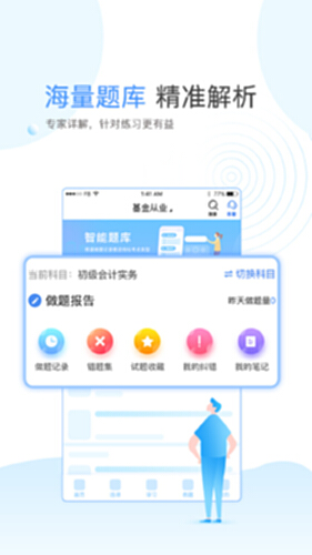 2、智能题库功能:提供章节练习、模拟测试、考前押题等多种练习方式,用户可通过题库练习,不断动态调整学习内容。同时,系统能智能生成答题报告,自动收藏错题,每题还配有专业答案解析,帮助用户精准攻克重点难点。
