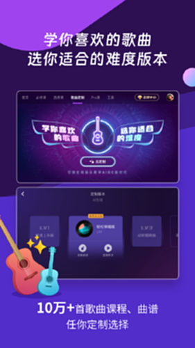 喜欢什么歌曲,您都可以定制对应的歌曲课程,而且可以根据自身的能力水平定制不同难度的版本,而且自动适配男生版或女生版,让您轻松学会弹唱自己喜欢的歌曲。
