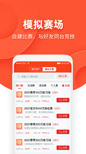 【自由模拟赛场】在这里不仅可以参与官方模拟比赛,也可以与好友自建模拟大赛,同台PK。
