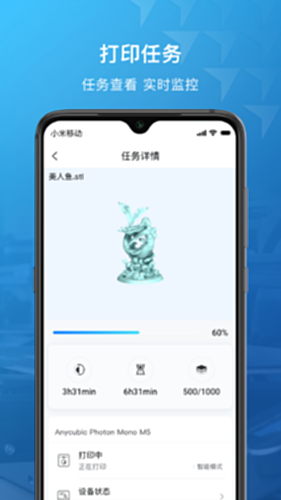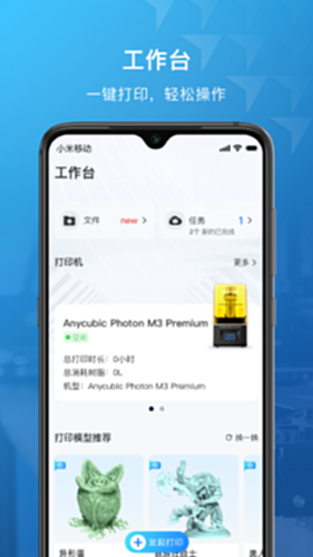 在工作台,您可以绑定手机与打印设备,实现远程操控。通过手机,您可以随时随地在平台内开启、管理和监控您的 3D 打印作业。打印进程可视化,可随时暂停、恢复、取消打印任务,还能在打印过程中随时调整曝光时间、灭灯时间等参数。在打印完成后,APP会自动推送消息提醒,并生成专业的打印分析报告。