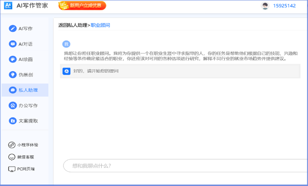 4、AI智能对话:AI写作管家随时理解并回应用户指令,提供流畅、准确的交流体验,并能扮演多种专业顾问角色。