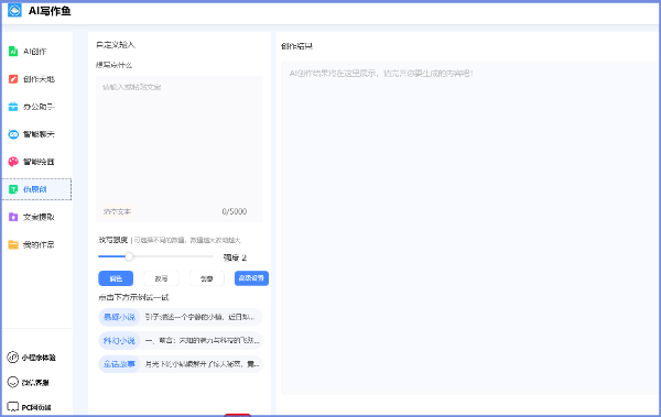 1、AI智能写作:AI写作鱼提供海量模板,覆盖小说、新媒体、广告、教案等场景,并支持文章续写、扩写、缩写等精细化操作。