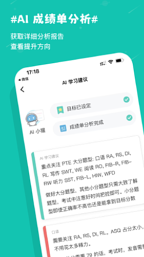 猩际 PTE 自研近似真考的评分系统,高度还原。猩际 PTE 还使用了 AI 评分,智能纠正单词的发音,流利度。 评分包含了听力、口语、阅读、写作的全部练习模块。
