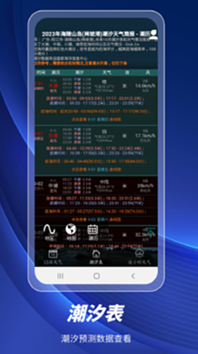 潮汐表:内置国内主要港口、岛屿及验潮站数据。查看涨潮退潮时间。