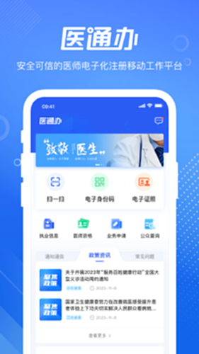 医通办APP是医师电子化注册移动工作平台,基于安全可信技术实现医师精准管理。