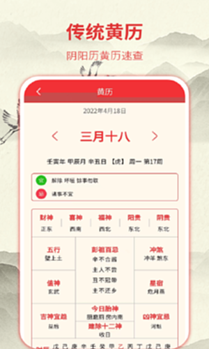 给您提供了中国传统的所有黄历数据,同时还附有黄历现代文解读,帮助您轻松掌握。