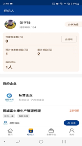 招聘企业/劳务中介在企业管理端可填写信息入驻平台;可发布职位、招聘员工;可号召用户成为自身企业的经纪人,为企业招聘员工;可对入职员工进行管理。