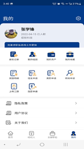 求职者在求职端选择职位、报名、到达地点面试、入职,获取奖励等。可在平台申请离职、转岗、加薪、借款、职业培训、职业晋升等。