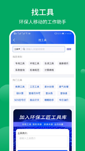 “环保工匠”APP提供了水处理、废气除尘、碳排放、工艺设计及换算等百余种工具;同时,开发了工程师、技术、设备等资源栏目,整理并收集了众多的技术规格参数及电子书材料,方便用户查阅学习,是一款创新研发的移动端环保工具产品。