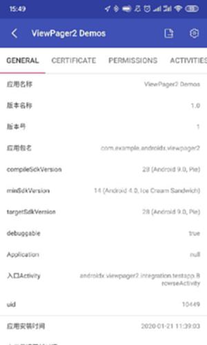 显示4大组件列表以及详细信息、应用权限相关信息、签名信息以及大量基础信息