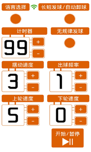 打开SuperEmper ,控制摆动速度设置可加减,0是停止摆动,1摆动慢,9是摆动快;出球频率设置可加减,0是停止出球,1是频率慢,9是频率快;上轮速度设置可加减,0是上轮不转,1是上轮慢,9是上轮快;下轮速度设置可加减,0是下轮不转,1是下轮慢,9是下轮快;自动长短球设置后可自动远近自动长短随机变化;自动卸球设置后可逆向反转;计时器功初始是99分钟自动运行后会自动倒计时,到00后所有的电机会自动停止运行;语音提示有中英文语音。