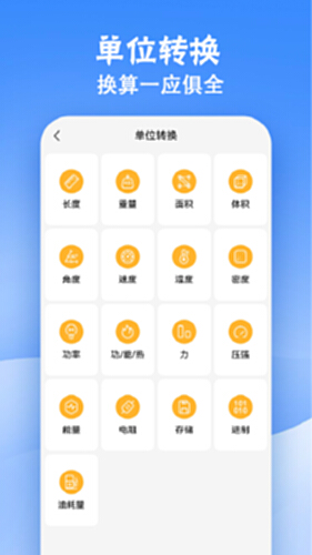 【单位转换】支持长度、面积、体积、质量、温度、压强、功率、功能热、力、密度、时间、角度、存储、进制、能量、耗油量、电阻等单位转换;