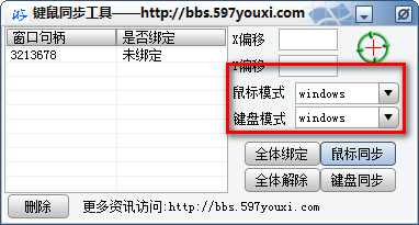 2、点击“全体同步”按钮进行绑定,成功则显示“已绑定”,失败则显示“绑定失败”对于客户端游戏,可能需要调整X偏移-5和Y偏移-25以适配。