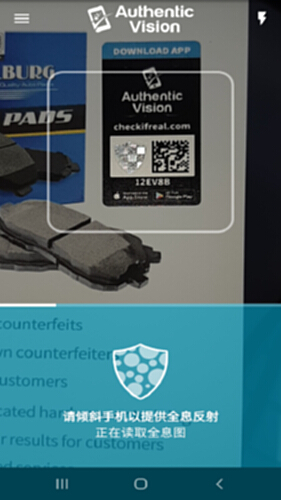 对于贴有Authentic Vision标签的产品,消费者可利用CheckIfReal对此类产品进行鉴定,确定其真实性。Checkifreal可提供安全、简单、智能自动化的产品鉴定,无需用户具备任何特殊知识,只需一台智能手机即可。