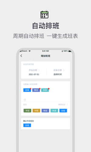 周期和手动两种排班方式,分别针对周期固定和不固定的工作人群;操作流程简单,可根据一个周期的工作安排自动生成专属工作班表.