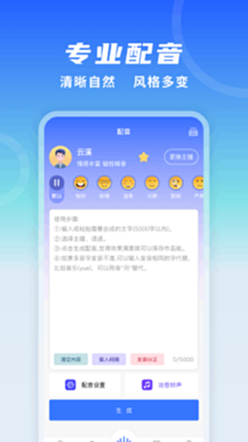 全能配音王是一款简单高效的文字转语音的智能配音软件,拥有100多个发音人,高逼真模拟真人发音,多种情绪发音可支持多场景使用。支持多语种多方言发音,支持WAV、MP3、MP4等多种格式在线下载,适用于短视频制作、商场广告促销配音、地摊叫卖录音制作、课件配音、企业宣传配音、超市商品播报、小说有声朗读等多种场景。