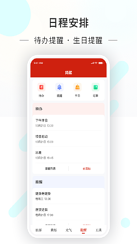 4. 日程:方便用户设置重要记事提醒,生日提醒,纪念日提醒,会议提醒,行程提醒,让工作和生活便利无忧