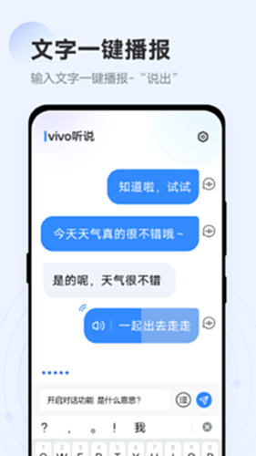 vivo听说是一款集实时语音转文字、文字播报等功能的专业App,用户在不方便说话或倾听情况下,可实现无障碍沟通,让沟通更简单~