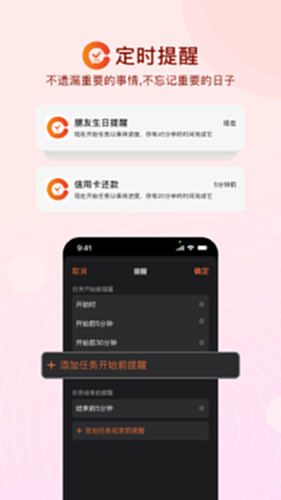 你可以在一个任务中添加一个或多个任务提醒。比如信用卡的还款日期;朋友生日前一周准备礼物;每天起床闹钟时间;对于健康,你也可以创建一天八杯水的提醒,每天早睡,以保证自己的身体健康。这样的例子还有很多,如植物浇水;宠物喂养;冰箱补货。